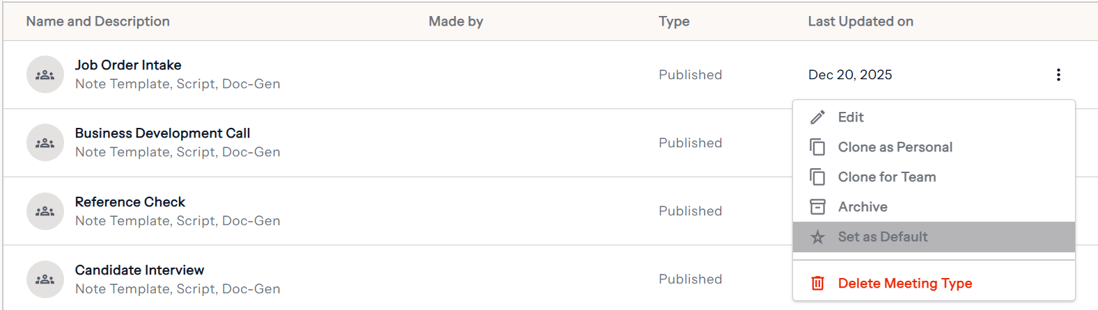 After setting the meeting as the default, you will see a red star indicating on the meeting type: