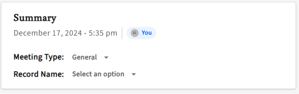 - From inside of the completed meeting, under 'Summary' on 'Record Name' click on 'Select an option'