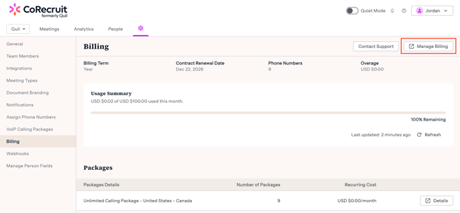 CoRecruit users who are not using the new VOIP system will not see the summary section, but can still navigate to the billing portal via the "Manage Billing" button.