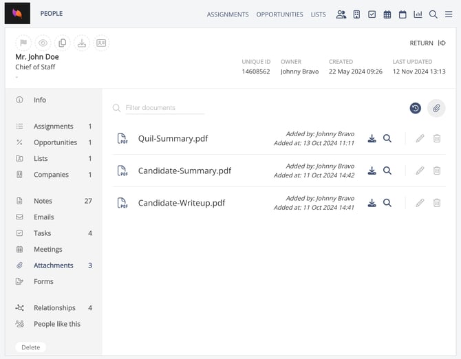 Follow-up material generated by CoRecruit can be automatically or manually uploaded to Ezekia if a record is linked. Documents are uploaded to Ezekia as Attachments.