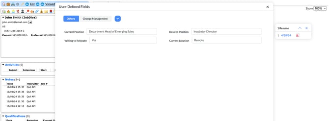 JobDiva fields can be updated automatically or manually via CoRecruit. CoRecruit will take the information from your meeting and fill in the blanks on your records. Fields are pulled directly from your JobDiva instance so any supported user defined fields will be available in CoRecruit.