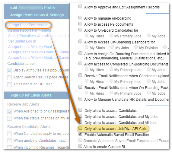 After creating a new API user, you must assign API permissions by navigating to Assign User Permissions and selecting "Only allow to access JobDiva API Calls".