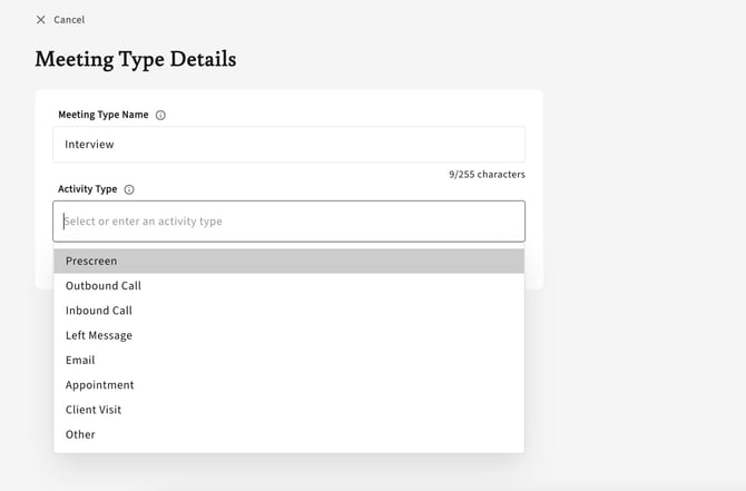 When integrated with Crelate, you can select from a dropdown menu the activity type you wish to be applied to your database notes.