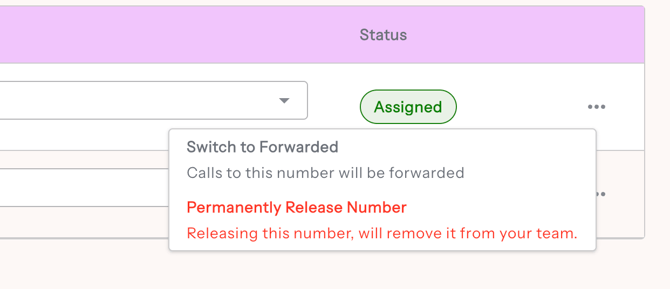 - Releasing: To permanently remove a number from the account, you must first Unassign it from the user, then click the three-dot menu corresponding to the phone number you want to release and select Permanently Release Number.