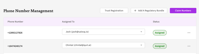 Team Owners and Admins can claim purchased phone numbers directly by going to Settings > Assign Phone Numbers. Once a number is “claimed”, it can be “assigned” to a specific team member