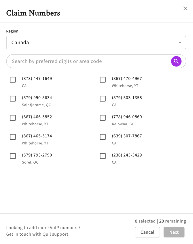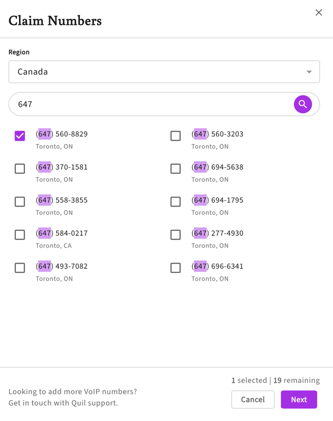 Use the search box to search for specific phone numbers. Enter 3 or more digits (e.g., "647" for Toronto) to see a list of available numbers. This will look for phone numbers that have your search term as a prefix.
