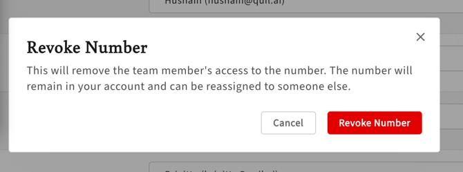 Once you hover over the team member’s name in the drop down field, you can see the “X” appear, which you can click to revoke the number. This moves the number back into the "Unassigned" pool and it can now be assigned to a different team member.