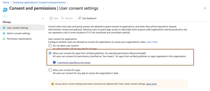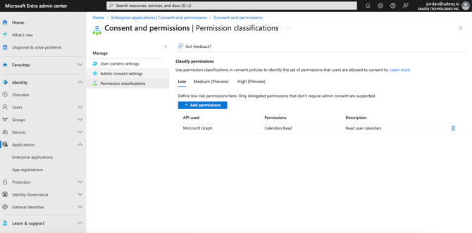Occasionally the "Admin Approval" flow may not work well for some teams for various reasons. If that is the case for you we suggest updating Entra's permission list to classify Calendars.Read as a "low impact" permission. This will allow normal team members to allow the integration without an IT admin.