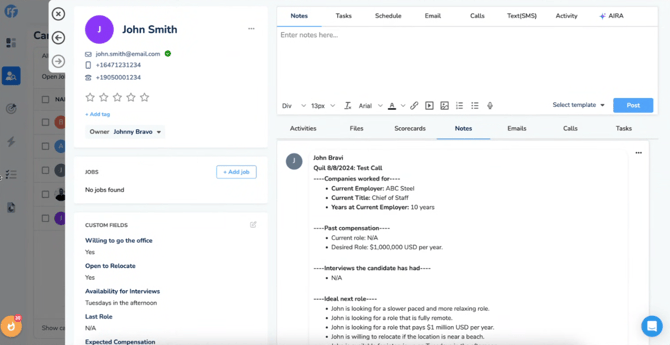 After submitting notes, they will appear in the “Notes” section on the candidate or contact record you selected.
