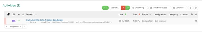 After notes are submitted, they will appear in the Job History & Activities tab under the Activities section on the Candidate or Contact record you selected.