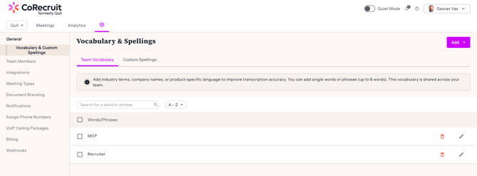 Team Vocabulary lets you add words and phrases that CoRecruit should listen for during transcription. When a word or phrase is in your vocabulary, the transcription engine pays special attention to it, making it far less likely to mishear or miswrite industry-specific terms, product names, company names, or recruiter-specific language.
