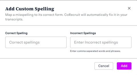 Custom Spellings lets you fix recurring misspellings in your transcripts. You map the incorrect form (what the transcript often writes) to the correct spelling (what it should say). Whenever the transcription engine produces the wrong version, CoRecruit will automatically replace it with the right one.